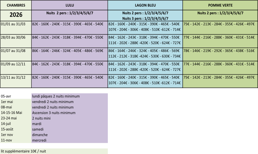 Tarifs chambres
